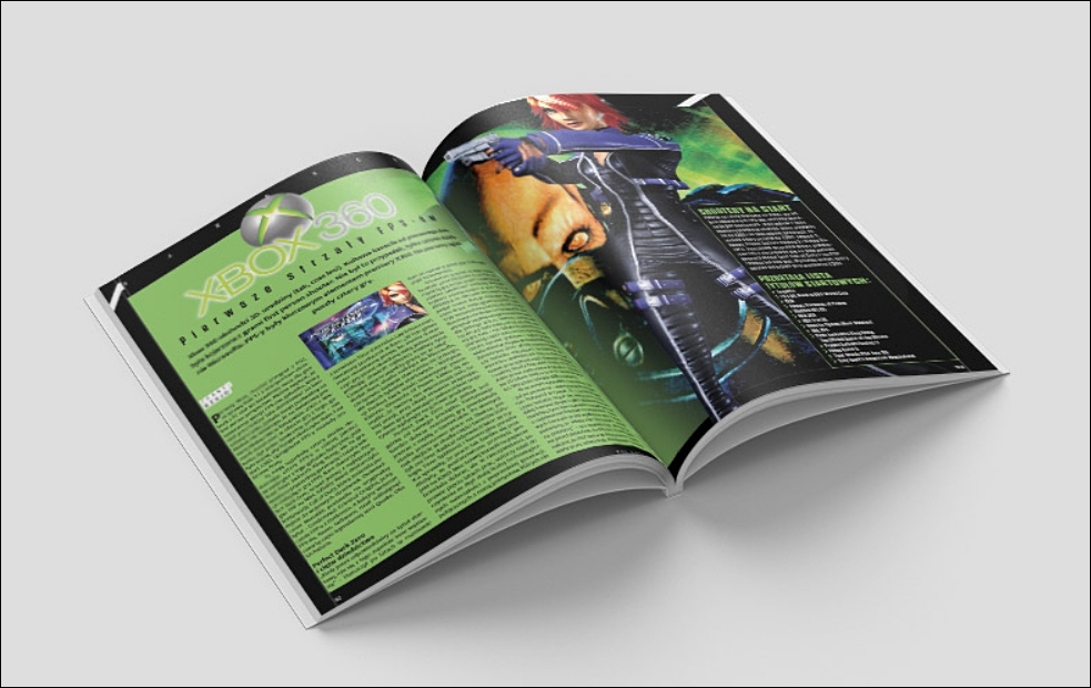 Dalej przechodzimy do części publicystycznej, gdzie nie żalowano stron. Każdy temat zajmuje co najmniej 3–4 strony, często z pełno stronicową grafiką. Wśród ciekawszych tekstów znalazł się m.in. materiał o FPS-ach na Xbox 360.